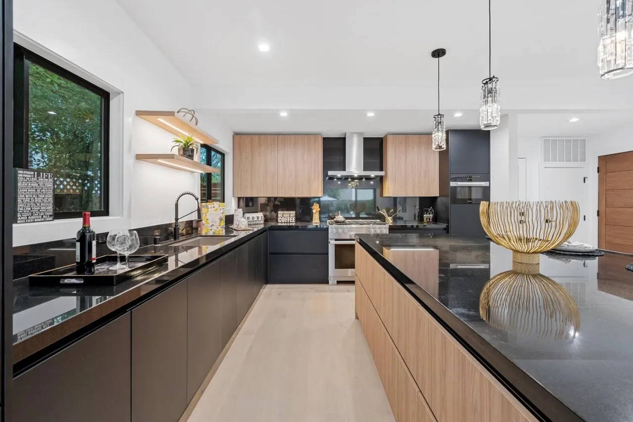 - Premium dark countertop and warm wood finish palette